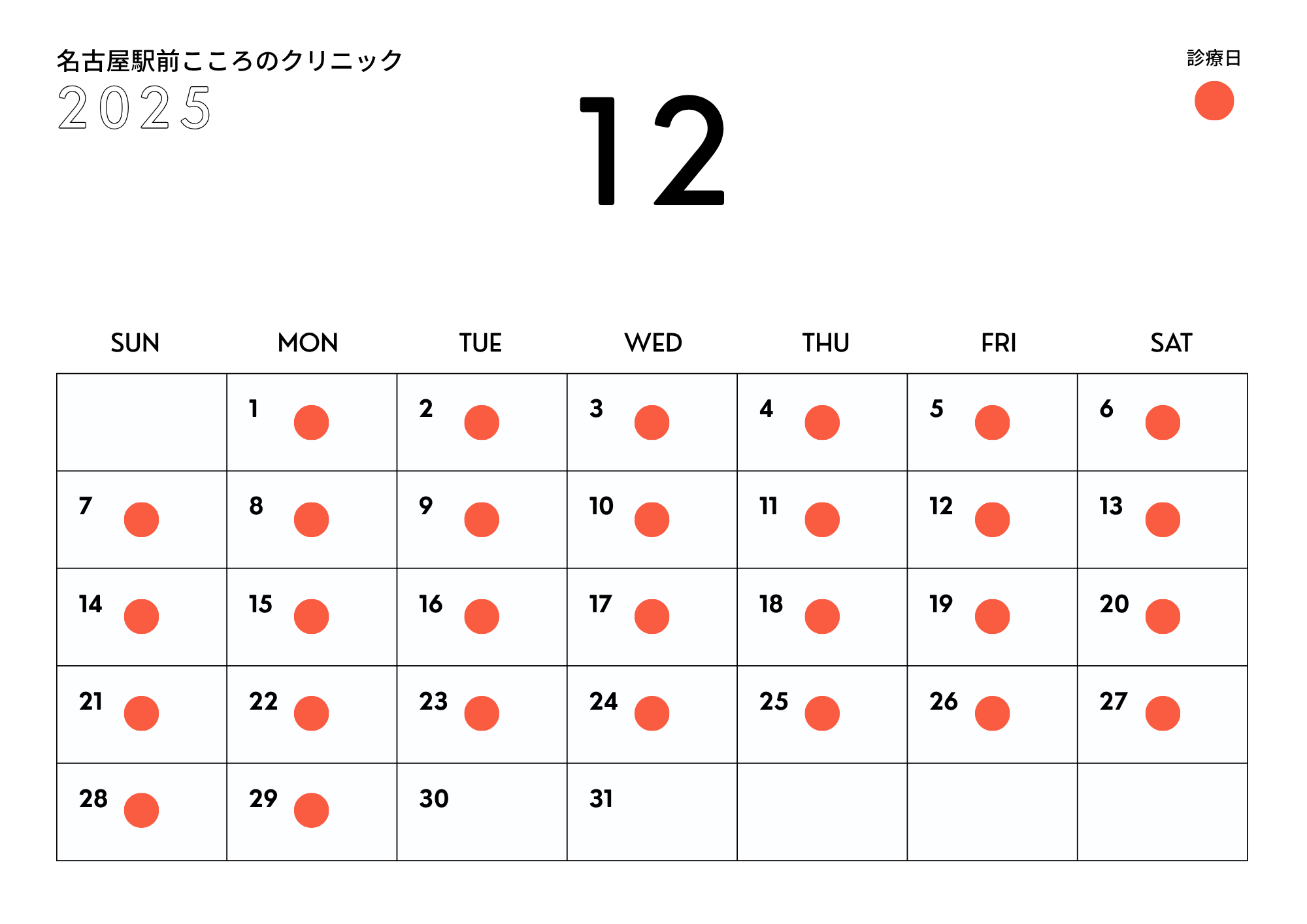 平素より当院をご愛顧いただき、誠にありがとうございます。 2025年12月の診療日について、ご案内申し上げます。 ■診療時間 10:00~14:00、15:30~20:00 ■休診日 12月30日(火)、12月31日(水) ■診療日 上記休診日を除く、月曜日から日曜日まで、休まず通常通り診療いたします。 休診日をご確認の上、お間違えのないようご来院ください。 どうぞよろしくお願いいたします。 24時間受付中 WEB予約
